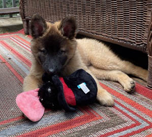 Noir was the first girl born in the litter and was the hardest for Sue to see leave - the Red puppies have been frequent "stayers" in previous litters. Her confidence was evident from 4 weeks on their first trip outside, when she ran out to explore while the others stood & stared at the new world! She showed excellent herding instinct as a 7 week old too. She is a busy girl now, learning lots & staying extremely cute. |