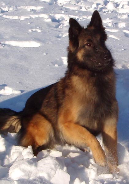 Targa inherited the incessant ball drive that her gramma Raja had, which has made her very easy to reinforce in training. She is a sweetheart who loves to give kisses and get attention. Targa became the first Champion Heartlet, finishing her AKC championship on Jim's birthday in 2007! She is the dam of our Top Litter, a singleton named Bogey. In early October 2008, Targa passed her first tracking test (in only 6 minutes!) to earn her TD and become an ABTC Versatile Tervuren. She finished her CD on Saturday 3/7/09 at the GLBTC specialty, then moved up and earned her first CDX leg with a first place! |