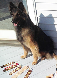 Alas, just 10 days before her first Nosework trial, we lost her due to incontrollable seizures, likely due to a brain mass that had started occasional seizures when she turned 12. She didn't get a chance to title in the sport she owned, but those who knew her know she would have crushed it. She leaves behind a host of memories, of a constant smile and wagging tail, and the intense desire to give kisses (as well as stealing Jim's beer and mead whenever she could). She was sometimes silly, sometimes infuriating, but always gave it her all - just like her name - From the Heart. |